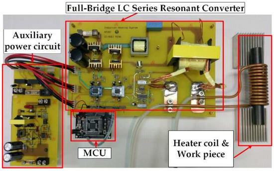 In this study, the proposed induction heating system is implemented and shown in Figure 18, where the proposed is mainly composed of a full-bridge LC series resonant converter, a microcontroller unit (MCU) (brand: Microchip, model: TMS320F28035), and an auxiliary power supply circuit. The system’s output power can be adjusted by adjusting the operating frequency of the power switches. The operating frequency ranges from 44 to 50 kHz, and the maximum input power of this system is 1.3 kW.