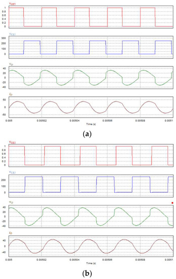 Table 4 shows the specification of the proposed induction heating system, where the input voltage is 250 VDC; the resonant inductor Lr = 150 μH; the resonant capacitor Ceq = 33 nF; the equivalent inductance of heating coil Leq is 1.25 μH; the equivalent resistance of heating coil Req is 0.5 Ω, the turn ratio of the transformer N1:N2 = 10:1; the heating coil has a 2.5 cm inner diameter and 13 turns; and the workpiece is a 2 cm diameter and 15 cm long cylindrical low-carbon iron.