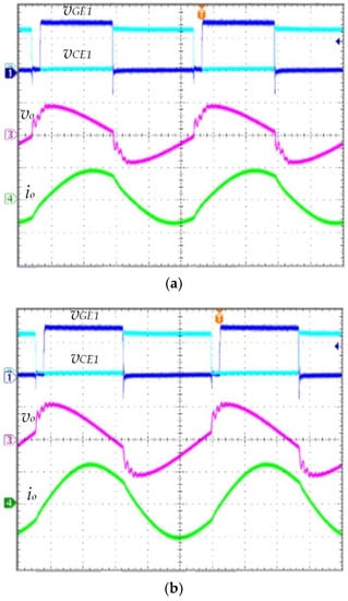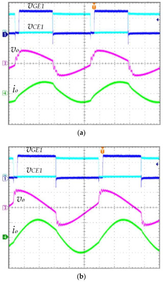 Figure 21a shows the control signal of the traditional control strategy, where the workpiece’s temperature is 500 °C, the operating frequency is 45 kHz, vGE1 (duty cycle) is 0.45, the peak value of the power switch voltage vCE1 is 250 V, the peak value of the output voltage vo is 35 VAC, and the peak value of the output current io is 40 AAC. The proposed MPPT heating control strategy (Formula (25) and hill-climbing algorithm) is shown in Figure 21b, where the operating frequency is 46 kHz, vGE1 (duty cycle) is 0.43, the peak value of the power switch cross-voltage vCE1 is 250 V, the peak output voltage vo is 41 VAC, and the peak output current io is 43 AAC. The hardware experiment results (Figure 21) are similar to the simulation results (Figure 19).