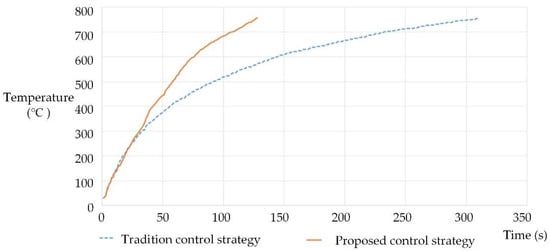 Figure 24 shows the heating duration of the proposed induction heating system, where the traditional heating control strategy (the blue dotted line) takes 320 s to reach 750 °C, and the proposed MPPT heating control strategy (the solid orange line) reaches 750 °C in 120 s.