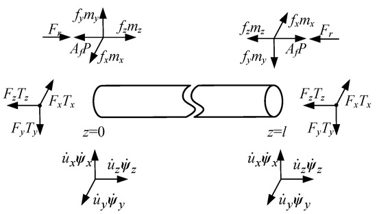 For the boundary at both ends of the pipe, it can be assumed that there exists a virtual mechanical node between the external excitation and pipe ends, which have a force balance relationship and motion continuity. The force balance and local coordinate systems for the boundary nodes at the ends of the pipe are shown in Figure 2, supposing one node as the analysis object, where , , and are constraint forces (including inertial force) in three directions, respectively, , , and are constraint moments, and is the external excitation. Additionally, if the actual pipe is an open end, the fluid force will be ignored, and the extra mass of the node needs to be considered, in case the pipe ends with lumped mass.