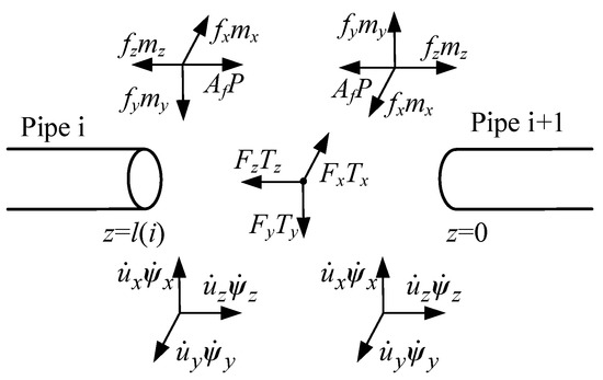 As the most common configuration of hydraulic pipe systems, the cascaded pipe usually consists of a series of straight pipe sections and elbow units. Regarding the side pipes of the connection node as different pipe sections, the force balance and motion continuity of the node at the middle constraint are shown in Figure 3.