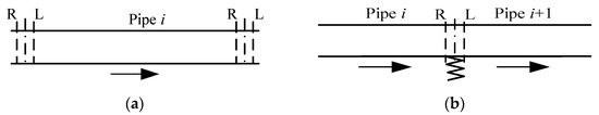 Note that, at this point, the middle constraint matrix represents the transfer relationship for the discontinuous character of the cascaded pipe (Figure 4), which is defined as a unit matrix when no constraints exist; the pipe areas are equal at the connections between the two pipe sections.