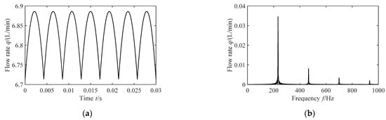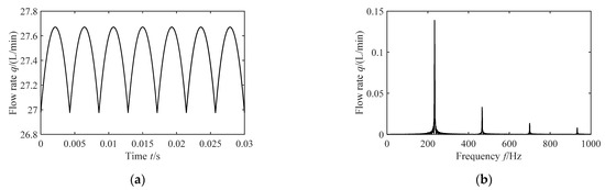 As shown in Figure 8 and Figure 9, the time domain curves of the flow pulsation change periodically with time; from the spectrum diagram, it can be seen that there are efficiency spikes at the fundamental frequency and its multiple frequencies, which means that the periodic function of the flow pulsation can be superimposed with a series simple harmonic pulsations. The first four natural frequencies, as well as the corresponding amplitudes, of the flow pulsation are compared in Table 3.