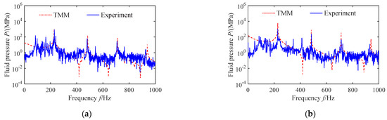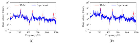 From Figure 7, it appears that the excitation at the left end of the pipe is fluid pulsation, and the flow fluctuation of hydraulic axial piston pump has been relatively maturely studied [1]. The rotational speed of the pump is set to 2000 r/min; when setting the pump flow as 6.82 and 27.3 L/min, the flow velocities are 2 and 8 m/s, respectively. Figure 8a and Figure 9a show that the flow pulsation of the hydraulic pipe can be obtained, and their spectra were further obtained in the frequency domain using the FFT method, as shown in Figure 8b and Figure 9b.