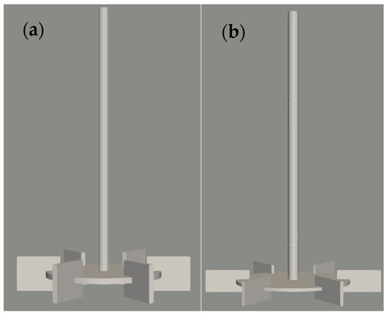 The system selected was a cylindrical unbaffled tank fitted with a RT. The geometry is obtained from [38], and some geometrical details are listed in Table 1 and shown in Figure 1 for two CFD models using two blade lengths (additional details can be found in Supplementary Materials). The system involved the use of water and air as fluids with their properties obtained at room temperature (T = 20 °C; ~ 1000 kg/m3; ~ 0.001 ; ~ 1 kg/m3; ~ 1.48 , = 101,325 Pa), and its surface tension coefficient () was taken as the standard literature value of 0.07 .