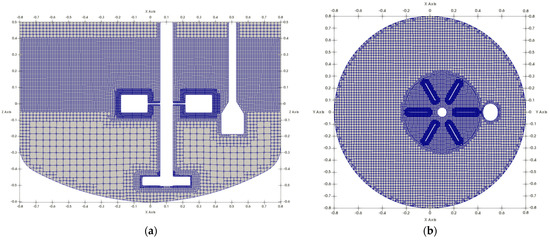In Figure 3, a cross-section of the mesh is shown with additional refinements close to the impellers and to the fluids’ interface (R3 in Table S2 in Supplementary Materials), where the top part of the reactor is excluded from the simulation by taking advantage of the total pressure boundary condition.