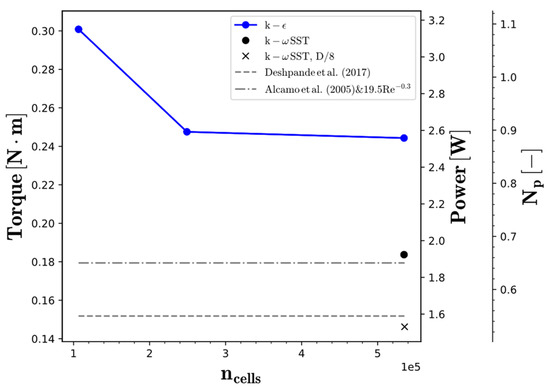 In Figure 4, it is observed that torque in R3 can be considered sufficiently refined. However, it is noted that the runs with the k-ε model tend to significantly overpredict the power required by the impeller compared to Deshpande’s value. In contrast, the SST model gives a more accurate prediction, but it is still not accurate enough (~20% difference). It is noted that in the work of [38] that the blades have a higher length with respect to the width. This affects the power drawn by the impeller since the cross-section of the blade is different, and it is known that the size and geometry of the impeller greatly affect the integration of forces [3]. A new run with the new blades (D/8) confirms that this is the case, achieving a more accurate value for the power number (~4%). The results of different CFD simulations are summarised in Table 4 for the different QOIs.