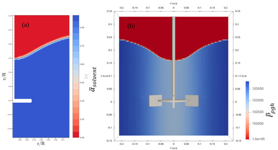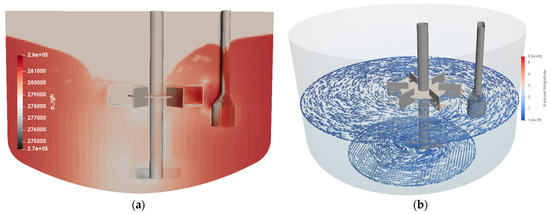 (a) Development of surface vortex () and (b) dynamic pressure field () of a cross-section of the stirring tank.