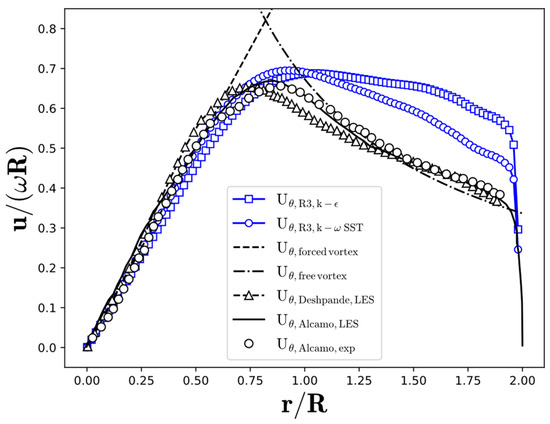 Normalised phase-averaged tangential velocity component along the dimensionless radial profile using the and SST model compared with LES simulation of [1,5].