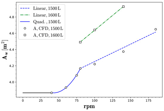 In Figure 12, for V = 1500 L, two different regions are observed. At low rpm, there is a high increase in area as a consequence of the development start of the surface vortex (which can be modelled quadratically). Once the surface vortex is established, a linear relation is observed within the rpms considered. The linear relation is also predicted for a higher liquid volume in the tank (V = 1600 L), and it is also observed to have a higher slope compared to V = 1500 L.