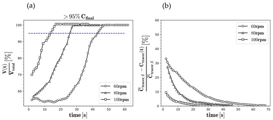 From Figure 14, can be determined as 47, 26, and 16 s for 60, 80, and 100 rpm, respectively, as indicated by the data surpassing the 95% volume occupancy. For these cases, the relative differences at were 1.76, 1.61, and 1.31%, respectively, suggesting that the contents can be considered sufficiently homogeneous for mixing applications.