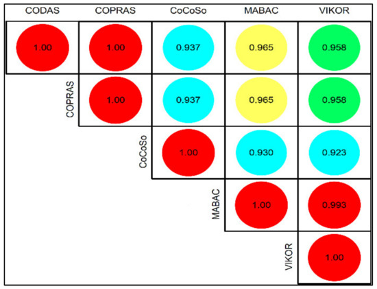 A correlation analysis has also been done to study the overlap and mismatch in the MCDM techniques used. The Pearson correlation coefficient was chosen as the measure to check the association of the ranks. It is a well-established measure of correlation for checking the linear association between two arrays. It is calculated as: