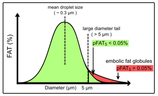 Normal globule distribution of a parenteral lipid emulsion with large diameter tailing. The shaded green area indicates the fat globule population with a lower proportion (pFAT5 < 0.05%) of large droplets (>5 µm). The shaded red area indicates the globule population with an embolic large droplet (>5 µm) amount (pFAT5 > 0.05%).
