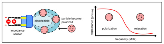 Dielectric spectroscopy (also known as impedance spectroscopy) is a technique in which an alternating current (AC) field is applied to the particle flow at different frequencies. Certain materials become polarized in AC fields and form a dipole (Figure 3). This ability is described by the dielectric constant, which can be determined by measuring the capacitance. If there is polarizable material in the electric field, the dipole induced in the material increases the capacitance. At very high frequencies (>100 MHz), the response of polarizable material is limited because the polarity of the electric field changes too rapidly to allow charge accumulation at the interfaces. At lower frequencies, the interfaces are fully polarized, causing the capacitance signal to forma low frequency plateau. This dielectric behavior of the capacitance as a function of frequency is called dispersion. An inline/online measurement technique based on dielectric spectroscopy has been combined with principal component analysis (PCA) [48,49]. The resulting frequency-dependent dielectric relaxations provide information about the heterogeneous structure of the system [50]. A special dielectric probe has been developed to measure dielectric properties between 0.5 and 50 MHz [51]. The dielectric loss spectra are influenced by ionic conductivity, and PCA allows the complete frequency range to distinguish between the influences of the oil and salt fractions. Using this technology, the particle size and the constituent fractions were determined simultaneously for a rapeseed oil-in-water emulsion. The work was extended by studying the effects of particle distribution, the presence of ions in the continuous phase and at the boundary surface, the temperature, and temperature changes [52]. The measurement system was calibrated by assuming a constant temperature and salt concentration, and knowing the type of emulsifier and the expected modality of the emulsion. Temperature fluctuations within a tolerance range of 5 K had little impact on the measurement, but larger fluctuations led to significant measurement errors. Monovalent ions in the continuous phase at concentrations exceeding 0.03 mol/L also affected the measurement and this must be taken into account during calibration.