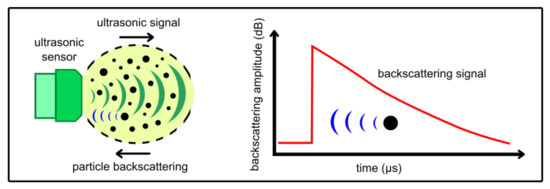 Ultrasonic backscattering. The sensor setup is shown on the left, with ultrasonic signal and particle backscattering. The backscattering signal with amplitude reflected from a particle population is shown on the right.