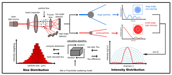 Laser diffraction determines the size of particles by reporting their interactions with light, based on the relationship between particle size and the angle and intensity of a scattered laser beam (Figure 6). The diffraction of waves is modeled according to the Fraunhofer approximation or the Mie scattering theory, the latter offering better results for most particles. A monochromatic laser beam is expanded and converted to parallel beams in an optical lens system before passing through the stream of particles. The diffracted light passes through a Fourier lens, which ensures that the diffraction pattern of any particle of a certain size, regardless of its position in the measurement volume, is always imaged at the same position on the ring detectors. The detector system provides a scattering light distribution which is converted into a size distribution by iterative calculations.