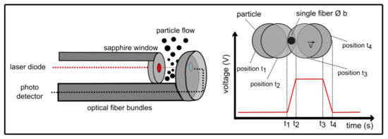 The real-time sizing of particles in different technical applications (Wurster coating, mixing, milling, spray drying, crystallization, fluid-bed granulation and high-shear wet granulation) has been descried for a modified SFT with a fiber-optic spot, which observes the shadow image of a particle moving through a single optic fiber [103]. The shadow image generates an impulse of a certain width, which is dependent on the particle size (Figure 10). The study showed the suitability of an IPP 70 inline SFT instrument (Parsum, Chemnitz, Germany) by using flushing cells and inline disperser units to measure particle sizes of 50–6000 µm with a velocity of up to 50 m/s. The feasibility of the SFT as a PAT tool was also established, using the same sensor system for a fluid bed granulation process [104]. Several process and formulation variables were studied using a two-level full factorial experimental design (DoE) to compare the inline SFT and offline laser diffraction. The results showed a consistent trend with significant deviations in the D10, D50, and D90 values (the size below which 10%, 50%, or 90% of all particles are found), but these were traced back to system errors caused by wall collisions during the laser diffraction measurement. The study suggests that the SFT is sensitive to changes in particle size during granulation. For the same process, the insertion depth, rotation angle, and sensor position were shown to affect the inline particle size determination and reliability [105]. The deceleration zone below the spraying nozzle of the granulator generates better particle count rates than the conical product container. The data were most reliable when the probe was placed 11 cm from the chamber wall, avoiding bias caused by the inlet air stream. The authors recommended the offline validation of measurements using laser diffraction for new product formulations.
