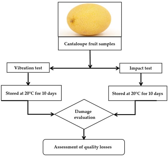 Flowchart describing the experimental setup (impact and vibration tests) on cantaloupe fruit.