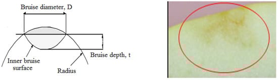 where W is the weight of fruit (N) and h is the drop height in (m). The impacted fruits were sliced from the middle of the bruised area to perform bruise measurements. The presence of visibly bruised tissue on the designated area of the fruit was used to identify bruising. The bruise diameter (D) and depth (t) were measured using a digital caliper. The bruise area (cm2) was used to represent the magnitude of the bruises [].