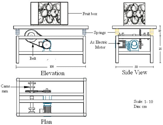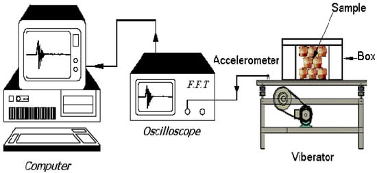 The duration and intensity of shaking, in connection with the magnitude of force repeated and displacement determine the decay of fruits and vegetables. When the forces exceed certain limits, the fruits are damaged and then lose their quality. As far as transportation is concerned, much attention has been paid to delicate fruits such as apples. Depending on the type of truck, the packaging, and the position of the container in the column, up to 80% of apples can be damaged during simulated truck transit []. Damage due to transport vibration has also been studied in other fruits and vegetables, e.g., peaches [,,], apricots [], potatoes [,], tomatoes [,,], grapes, strawberries [], and apples [,,,,].