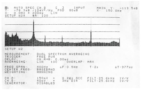 The vibration simulator used in this study was identical to that described by Khodaei et al. []. A laboratory vibration simulator consists of a steel body with a table attached to it and four springs connecting the table to the body, as shown in Figure 4. A laboratory vibration simulator driven by an electric motor (1 hp and 1450 min−1) converts the motion into groups of through belts and finds the four cams that give the horizontal motion, while the vertical motion is provided by the four springs attached to the table, resulting in only vertical vibrations. The motor was utilized to provide amplitudes and frequencies that covered a truck’s usual range, as well as higher frequencies up to 200 Hz. Undamped forced vibrations were produced by an actuation system with adjustable springs on the table, which produced only vertical vibrations. The response of the sample was measured by a lightweight piezoelectric accelerometer, which was attached to the opposite direction of the vibration tables. The accelerometers were wired into a charge amplifier (Brüel& Kjaer, Nexus, 2692, Teknikerbyen 28, DK-2830 Virum, Denmark) and the signals were recorded on a digital tape recorder (TEAC Corp., RD-135 T Dual Speed 8-Channel DAT Data Recorder, San Mateo, CA, USA). The recordings were made randomly with recordings of 300 s throughout the track. A fast Fourier transform (FFT) algorithm was used to compute the power spectral density of each sample of registered signals in the range of 0–200 Hz with a resolution of 1 Hz (PSD).