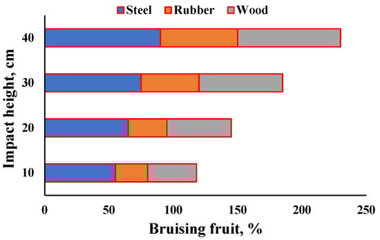 According to the results, the percentage of bruising (%) was high for the steel surface, but decreased for the wood and rubber surface. The consistent observation of all treatments was that the falling of fruit from a height of 10 cm led to the lowest percentage of bruising for all fruits, followed by 20 cm. Consequently, we can conclude that with an increase in the high impact, the number of bruises increases, which is due to some physical and chemical factors that occurred in the fruit, such as the conversion of carbohydrates into sugars and the shrinkage of fruit due to high water loss. This is especially relevant after the harvest and during the storage period, due to the increase in biological processes, such as a high respiration rate and high water loss due to the opening of cells.