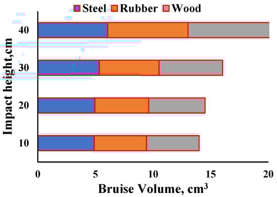 Bruise volume of fruit due to different impact heights at different impacted surfaces.
