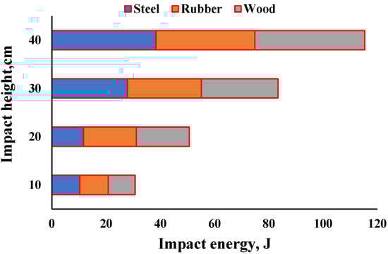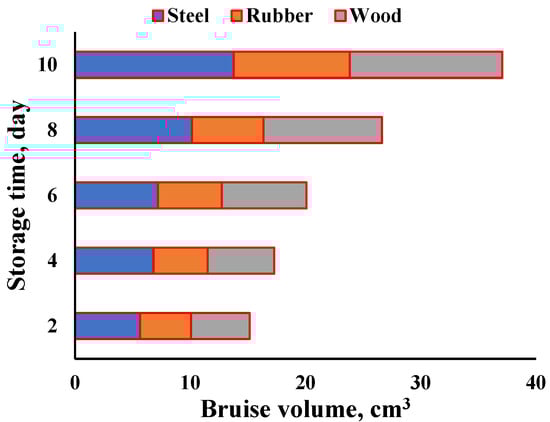 The relationship between the bruise volume and the impact height is shown in Figure 8. The volume of bruises increased as the impact height increased, and it was highest at 10 and 20 cm for steel surfaces, but highest at 30 and 40 cm for wood surfaces. However, as shown in Figure 8, the bruise volume rose as the impact height increased. Figure 9 depicts the relationship between impact energy and impact height. The impact energy increased with increasing impact height and was highest at 30 and 40 cm of impact height. Figure 10 depicts the effect of storage time on the bruise volume of fruits. The bruise volume increased on the different surfaces (steel, rubber, and wood) as the storage time increased; the bruise volume reached its maximum values for the steel surface in the first week, increased on the wood surface after the first week, and decreased on the rubber surface.