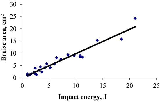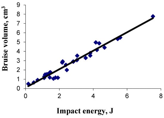 The relationships between bruise area and bruise volume vs. impact energy are shown in (Figure 11 and Figure 12). The impact energy was shown to be linearly related to the total bruising area and volume. The shape of the relationship between bruising area and bruise volume vs. impact energy was predicted by the elastic model. The bruise area and volume play an important role in impact theory, and they are visible and easily measured parameters in practice. According to elasticity theory, the bruise area and volume following the impact are related to the impact energy and the elastic modulus. When the bruise area and volume were plotted against the impact energy in these studies (Figure 11 and Figure 12), the regression analysis revealed a highly significant linear association between these parameters [].
