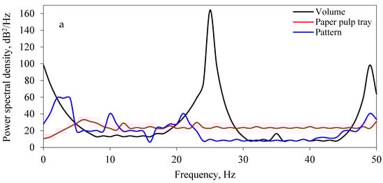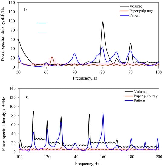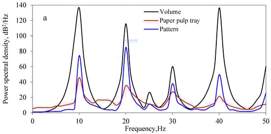 The PSD values for the paper pulp tray packaging were higher than the values for pattern packaging and for the volume packaging. It was also observed that the PSD values decreased with the increase in vibration frequency. At 100–200 Hz, the PSD values for the pattern packaging were higher than the values for the paper pulp tray packaging and for the volume packaging.