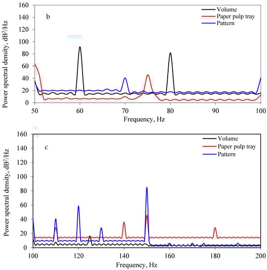 Figure 13 shows the PSD values at different vibration frequencies and for different packing methods and a duration of 5 min. Some differences in PSD values can be seen in Figure 13. At (0–50 Hz), the PSD values for volume packing were shown to be higher than the values for pattern packing and for paper pulp tray packing, which can be attributed to the packing method of the samples and the paper between the samples that damped the vibration, so that the values decreased. However, at 50–100 Hz, the PSD values generally decreased, followed by the values at 0–50 Hz. The PSD values for volume packaging are higher than the values for pattern packaging and for paper pulp tray packaging. It was also observed that the PSD values decreased with the increase in vibration frequency. At 100–200 Hz, the PSD values were higher for volume packaging than for pattern packaging and for paper pulp tray packaging.