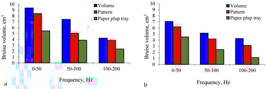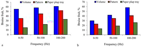 Simulations were conducted to quantify the effect of the packing method on the mechanical damage incurred during the transport of cantaloupe. The data are shown in Figure 15. It was found that the bruise volume decreased with an increasing vibration frequency from 0 to 200 Hz for the different packing methods. In the subsequent analysis of the distribution of the bruise volume, the damage was highest for the volume packaging, followed by the other packing methods. It can also be seen that the bruise damage increased with the increasing vibration frequency. When the fruit package’s resonance frequency coincided with the excitation frequency, the product’s acceleration can be considerably enhanced, resulting in severe fruit damage []. According to Shabazi et al. [], raising the vibration frequency from 7.5 to 13 Hz had a substantial influence on the lowering of the elasticity modulus of a watermelon’s flesh under constant acceleration. It is worth noting that increasing the vibration frequency at a constant acceleration minimizes the displacements of each fruit during transportation, lowering the impact numbers between the fruits and therefore reducing damage. Pretorius and Steyn [] compared the resonant vibration frequencies calculated for different types of fresh produce with the vibrations experienced on fresh fruit containers during transit. Furthermore, according to Jarimopas et al. [], the frequency range between 5 and 20 Hz reflects the axle hop response, and these frequencies are typically passed to the fruit load inside the packing, particularly in the case of a defective truck suspension.