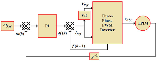 In this analysis, a PI controller is applied to vary the frequency with respect to the reference speed, as shown in Figure 3. Z−1 is the unit that states the sampling time of speed feedback. Speed error between reference speed (ωRef) and actual speed (ω(k)) is handled through the PI controller, which decides frequency variation df (k). The df (k) is added with the existing frequency (f(k-1)) and acts as a reference/fundamental frequency (fRef) of the inverter. Meantime voltage is varied to keep the V/f ratio as constant as possible based on the newly developed frequency. The new frequency and voltage act as a reference for a three-phase pulse width modulation (PWM) inverter, which supplies a three-phase induction motor. Thus, with this method of control, the speed of the motor can be changed while the torque stays the same.