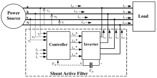 Figure 4 shows the basic theory of compensation using the Shunt Active Power Filter. In Figure 4, {a, b, c, N} is an indication of three phase and neutral, {isa, isb, isc, isn} is a source current, {ia, ib, ic, in} is a load current, {ica, icb, icc, isn} is a compensating current, {ica*, icb*,icc*,isn*} is a reference current, {va, vb, vc} is a source voltage, and Vdc is a DC link voltage.