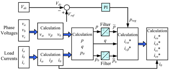 Instantaneous active and reactive power theory, popularly called the p-q theory control, was proposed by Agaki et al., in 1983 [26]. A control block illustration of p-q theory is depicted in Figure 5.