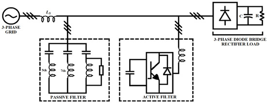 Figure 6 illustrates the hybrid power filter (HPF) arrangement for a three-phase three-wire system. By attaching an active filter in a shunt along with a passive filter, the HPF is constructed. The hybrid filter is linked to load in parallel and conquers the harmonics in current produced by a non-linear load. Every passive filter containing a tuned circuit consists of capacitor and inductor, attached to every phase of a three-phase system. The constraints of electrical resonance of tuned circuit of a passive filter are valuable in reducing harmonic orders equivalent to a specific frequency, thus giving a minimum impedance method for the harmonic currents to pass over the system that gives the load. A shunt active power filter typically contains power electronics converters, which are specifically made for injecting harmonics currents, equivalent in magnitude but conflicting in phase, to recompense non-linear load harmonics [31]. The filter controller depends on the modified instantaneous active and reactive power theory (the p-q theory) [32].