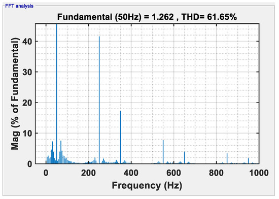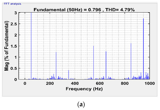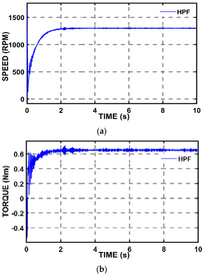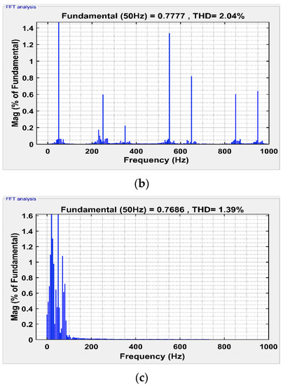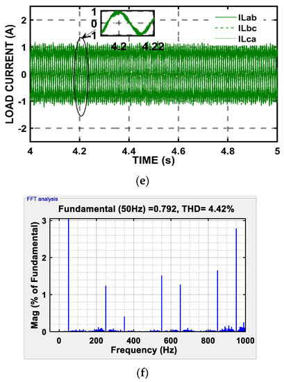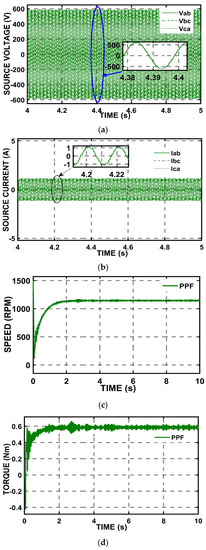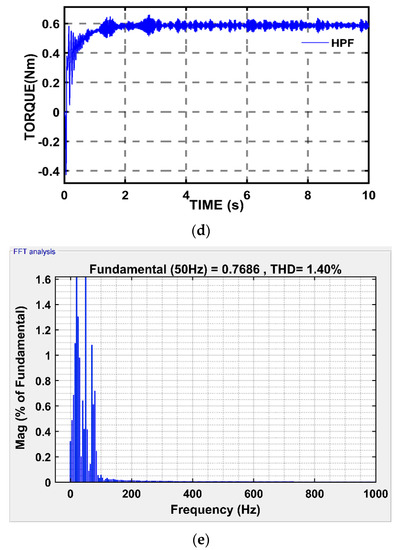 From Figure 8, it is observed that speed is maintained at 1144 RPM, while torque is maintained at 0.6 Nm. The load current shown in Figure 8e displays the noise in current due to power electronic circuit and nonlinear load. The effect of passive filter in removing harmonic distortion are shown in Figure 8a,b. Source voltage and current exhibit some distortion in wave shape, which shows deficiency of PPF. The PPF has a source current THD of 4.42% and a source current of 0.792 A in this case.