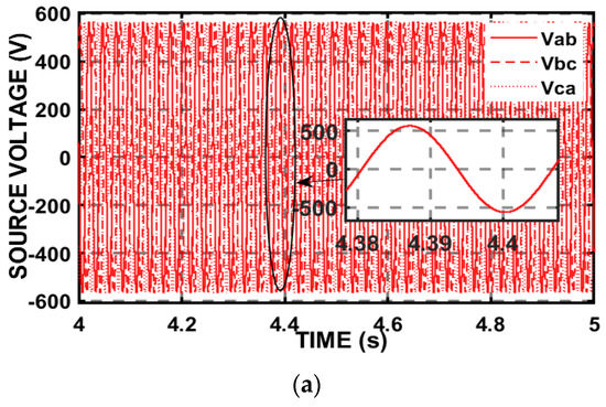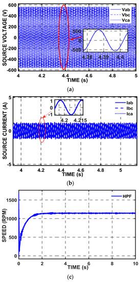 As same as the above-mentioned analysis, during the time speed and torque are maintained constant. An effective filtering by HPF is displayed as the source voltage and current shape in Figure 10a,b. HPF has a source current THD of 1.40%, which is much lower than the filters mentioned above. The benefits of the combination of both filters are minimal harmonics. The source current is 0.7686 A, which is lower than both analyzed filters: 0.0092 A reduced compared SAPF and 0.0234 A reduced compared to PPF.