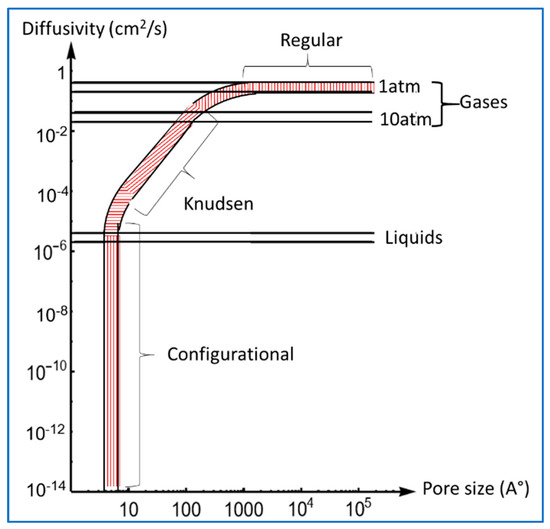 As discussed earlier, diffusion coefficients are required for the calculation of fluxes for the transport of molecules in straight pores or in porous media including the porous matrix of the catalysts and reservoir formations. Depending on the molecular size and pore size of the capillary or the fabric of the porous matrix/tortuosity, the diffusivity of a gas varies in orders of magnitude. Figure 2 shows schematics of the order of diffusivities of gases with respect to pore size (obtained from [3,126]).
