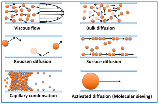 There are primarily six mechanisms for molecular transport in a capillary [3,5], namely (i) viscous flow, (ii) bulk diffusion, (iii) Knudsen diffusion, (iv) surface diffusion, (v) capillary condensation, and (vi) activated diffusion (see Figure 3 for schematics). One particular mechanism may be dominant over another depending on pressure, temperature, pore size and pore-fluid interactions. In addition, the diffusion rate may also vary from one mechanism to another. For example, a gas can diffuse faster if the pore size is larger, while diffusion can be slower or restricted when the pore size is smaller. Similarly, the chemistry at the pore level (such as adsorption) can also alter the way a gas will diffuse through the pore. In general, the diffusion rate decreases as we go from viscous flow (first mechanism) to activated diffusion (sixth mechanism). In the first two mechanisms (viscous flow and bulk diffusion), where the diffusion rate is higher, the diffusion is independent of solid–fluid interaction and the property of the fluid is the same as in the bulk (uniform), while in the other mechanisms (Knudsen, surface, capillary condensation and activated diffusion), the fluid may interact with pores and the fluid properties may be different than the properties in bulk.
