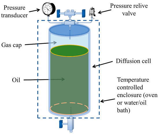 In particular to petroleum engineering applications, diffusive mixing can be a dominant mechanism in various processes such as enhanced oil recovery in CO2 flooding [20,21,22,23,24], Vapex [25,26], gas re-dissolution process in a depleted reservoir or solution gas drive process [27], drilling [28] and acid fracturing [29,30]. For example, in a depleted reservoir, where gas is injected to repressurize the reservoir via gas re-dissolution processes, the rate of gas dissolution is governed by molecular diffusion in the far field (because there is no mechanical/convective mixing mechanism in place within the reservoir). Thus, while the extent of dissolution (and hence re-pressurization) depends on gas solubility in the oil, the time of dissolution (or re-pressurization) is controlled mainly by molecular diffusion, even for light hydrocarbon systems [46,47,48,49,50]. In CO2 flooding of a fractured reservoir [20,21,22,23,24], the direct contact between residual oil and CO2 is blocked by high water saturation behind the displacement front, which prevents the development of miscibility and potentially leads to poor oil recovery. However, diffusion of CO2 through the blocking water helps break the water barrier to a certain degree. This enables the mixing of CO2 with residual oil, resulting in its swelling and viscosity reduction, which leads to higher oil recovery [23,24,25,26,27,28,29,30,51]. In the Vapex process for heavy oil and bitumen recovery [25,26], light hydrocarbons or non-hydrocarbons are injected. It is their diffusion into the oil beyond the potential fronts and/or convective zones that promote the effectiveness of the displacement process via reduction of in situ viscosities. In solution gas drive processes [27], the gas bubbles are evolved when reservoir pressure reduces below bubble point. It is the diffusion of gas bubbles into the oil that governs the rate of bubble growth, which directly impacts the gas mobilization and hence the oil recovery. Thus, the gas diffusivity in oil plays a key role in these displacement processes and accurate determination of it is essential to the design and understanding of such processes. In addition, the diffusive mixing is important in drilling operations [28] as well. Drilling fluids are used to insure enough hydrostatic pressure on formation to prevent the influx of formation fluids into the wellbore. However, diffusion of gases (present in the formation fluid) into the drilling fluid can lead to such an influx (also called gas kick), especially because of failures in the operation, such as insufficient drilling fluid weight and circulation loss. To detect and avoid such a mixing of gases from the formation with the drilling fluid, it is important to characterize the diffusive interactions between formation and drilling fluids along with their thermodynamic behavior.