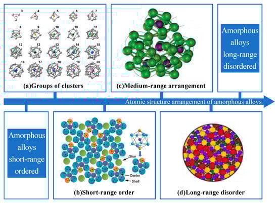 Amorphous alloy is a functional material emerging in the 21st century, also known as metallic glass (MG), which has a unique internal structure with long-range disorder and short-range order in the arrangement of atoms in the 3D space [1], which does not have the grain boundaries in ordinary metallic materials and has the properties of both metal and glass. The arrangement of amorphous alloys can be divided into short-range with regular clusters, medium-range, and long-range with irregular arrangement of clusters, as shown in Figure 1. Amorphous alloys have no fixed melting and boiling points and are isotropic [2], which is distinctly different from crystalline materials. The special atomic structure results in amorphous alloys having excellent properties, such as lower density, high strength, high hardness, and high resistivity, as well as excellent friction resistance, corrosion resistance, and soft magnetic properties, thus, amorphous alloys have received widespread attention.