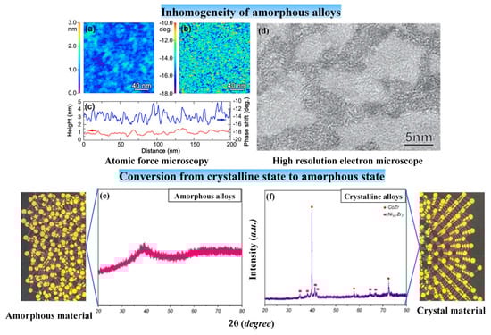 Secondly, amorphous alloys are isotropic in physical properties, while crystal metals are anisotropic. Although amorphous alloys are isotropic, amorphous alloys are structurally and kinetically inhomogeneous [14,15,16]. Observation of AFM can find that the amorphous alloy has a phase shift on the nanometer scale (please see Figure 3a–c). After ultrasonic treatment, soft and hard regions appear in the amorphous alloy due to crystallization (please see Figure 3d). These are manifestations of the inhomogeneous structure of amorphous alloys. Meanwhile, amorphous alloys do not have a definite melting point [14], while crystal metals have a definite melting point at room temperature and atmospheric pressure. For example, plastics and glass, as amorphous materials, are heated to gradually soften and eventually become liquid. And amorphous alloys have a glass transition temperature point (Tg), while crystal metals do not [17].