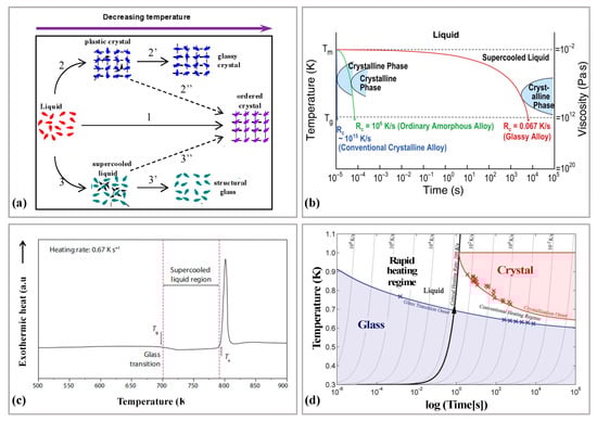 Amorphous alloys develop an amorphous structure by cooling the metal from the melt at a critical cooling rate below the glass transition zone. In addition to the amorphous structure obtained by rapid cooling of the liquid, it is also possible to form ordered crystalline structures and plastic crystals in the liquid cooling (please see Figure 5a). To ensure that a completely amorphous state is obtained during the preparation, a very high cooling rate (106 K/S) is required, as shown in Figure 5b. Thus, limiting the amorphous alloys to often prepare only low dimensional size alloy samples, such as powders and thin strips, and it is difficult to form BMGs with larger critical dimensions, which is the so-called poor GFA of amorphous alloys, Johnson expressed the GFA by the critical cooling rate Rc [46]: