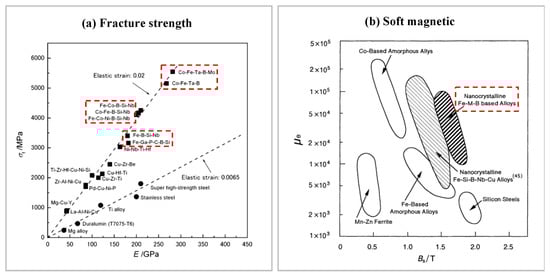 Obviously, amorphous alloys have many excellent properties. Amorphous alloys have some record-breaking excellent physical and chemical properties, such as strength, toughness, hardness, and modulus, which break the record for metallic materials [54,56,57,58,59,60,61,62], almost every type of amorphous alloy reaches several times the strength of the crystalline material of the same alloy family. Some amorphous alloys also have excellent soft magnetic properties, catalytic properties, and good wear resistance and are widely used in various applications [63,64]. Fe-based nano-amorphous alloys have outstanding magnetization strength and permeability (please see Figure 6b), even better than the comprehensive soft magnetic properties of silicon steel, which is an indispensable soft magnetic material in the power, electronics, and military industries. Different structural configurations exist for amorphous alloys of the same composition [65]. Therefore, the physical properties of amorphous alloys can be regulated by time and process conditions. Meanwhile, amorphous alloys have a wide range of forming compositions [66], and their structure and properties can be modulated by composition. And even amorphous alloys within the same system can possess different properties depending on their composition. For example, there are Fe-based amorphous alloys that can reach a maximum critical size of 16 mm, while there are Fe-based amorphous alloys that have poor GFA but possess excellent soft magnetic properties [67,68].