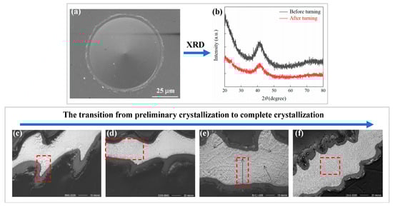 Xiong et al. [78] further showed that when the temperature of the cutting area exceeds Tg, viscous flow occurs in the cutting area, resulting in additional friction between the tool and the workpiece, and aggravating the temperature rise in the cutting area. If the temperature of the cutting area is higher than Tg for a long time, a surface oxide was generated. Meanwhile, as mentioned above, when the temperature exceeds Tg, the amorphous alloy will crystallize, thus affect the machining. Therefore, the change in temperature of amorphous alloys undercutting and whether the material undergoes crystallization have become the focus of many studies. For example, Maroju and Jin [72] found that the cutting temperature is lower than the crystallization temperature in the cutting experiment of Zr-based BMG. However, such satisfactory results were not obtained under all conditions. Bakkal et al. [80] found that at low turning speeds, the machined surface and chips did not crystallize. At high turning speeds, the BMG of the outer layer is oxidized, and the chips appears to be crystallized to different degrees, as shown in Figure 8c–f. As mentioned in Section 2.1, the formation of nanocrystalline or nanocrystalline/amorphous composites can lead to improvements in material properties. Fu et al. [81] found that high-energy ion milling can make BMG form nanocrystalline phases. When crystallization cannot be avoided in the machining of amorphous alloys, the formation of nanocrystalline phases may be a good choice.