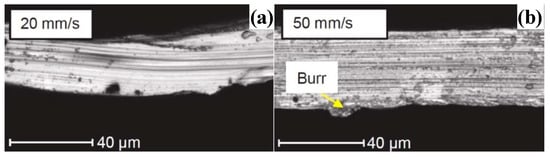 The cutting temperature in the machining of amorphous alloys also affects the machining performance of amorphous alloys in terms of the shear band. Zhang et al. [82] expressed that the deformation of BMG after turning was at least partly caused by the adiabatic shear temperature rise. Increased shear speed leads to significant melting of the workpiece surface due to temperature rise in the shear zone. The melting phenomenon caused by the high temperature in the shear zone is also manifested in the chips, and the melting of the chip surface is more serious at higher shear rates, as shown in Figure 10. Although it is confirmed that the temperature rise in the shear zone affects the machining performance of amorphous alloys, in some cases the temperature rise can actually improve the properties of amorphous alloys. Basak and Zhang [83] found that the surface temperature rise of amorphous alloys caused by contact sliding friction heat increases the hardness of MG.