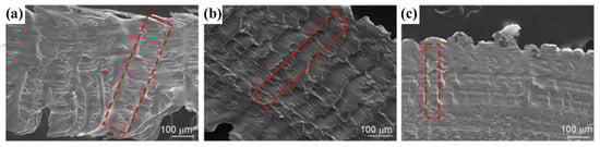 SEM micrographs of the underside of BMGs chips at different shear speeds: (a) 1.06 m/s, (b) 0.50 m/s and (c) 0.25 m/s, reprinted with permission from Ref. [82] 2011, Springer. The red mark is the degree of melting of the chip surface.
