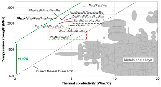 Compressive strength versus room temperature thermal conductivity of metallic glasses, metals, and alloys in Ashby’s material space. Conventional crystalline alloys are shaded while other amorphous alloys are in orange and red, reprinted with permission from Ref. [97] 2018, Elsevier.